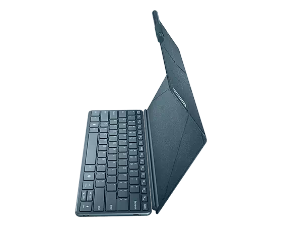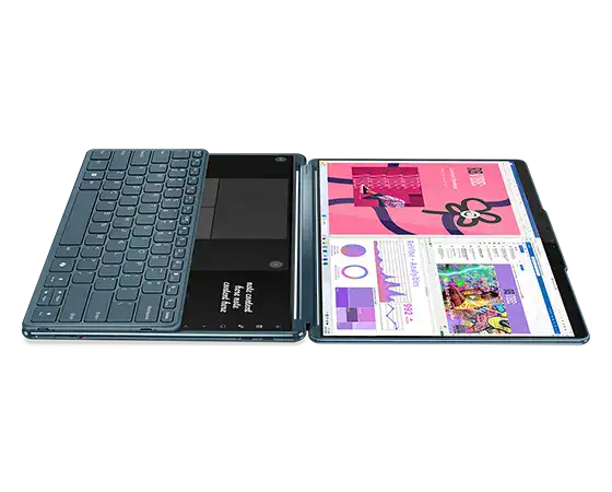 De Yoga Book 9i is klaar voor gebruik. Naast het apparaat zelf wordt de Yoga Book geleverd met een Bluetooth® - toetsenbord en -muis, een styluspen en een foliohoes. De innovatieve foliohoes is een meesterwerk in origami-stijl. Compact en slank gesloten, ontvouwt hij zich tot een stabiele, veelzijdige standaard die in elke kijkhoek past. Hij is magnetisch ontworpen om het draadloze toetsenbord vast te zetten en bevat een speciale houder voor de styluspen.